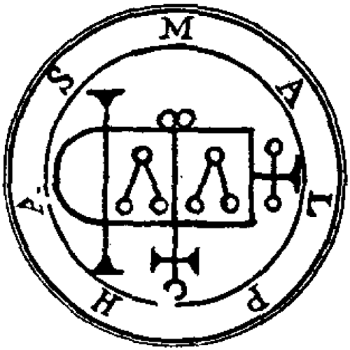 (39.) MALPHAS. - The Thirty-ninth Spirit is Malphas. He appeareth at first like a Crow, but after he will put on Human Shape at the request of the Exorcist, and speak with a hoarse Voice. He is a Mighty President and Powerful. He can build Houses andHighTowers, and can bring to thy Knowledge Enemies’ Desires and Thoughts, and that which they have done. He giveth Good Familiars. If thou makest a Sacrifice unto him he will receive it kindly and willingly, but he will deceive him - that doth it. He governeth 40 Legions of Spirits, and his Seal is this, etc.